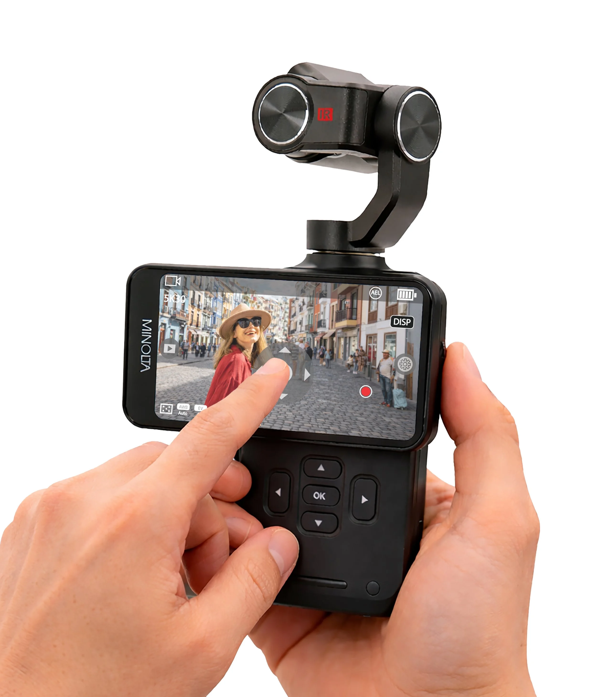 A motorized 3-axis gimbal actively stabilizes and rotates the lens, allowing smooth, steady framing across a wide range of angles while you move.