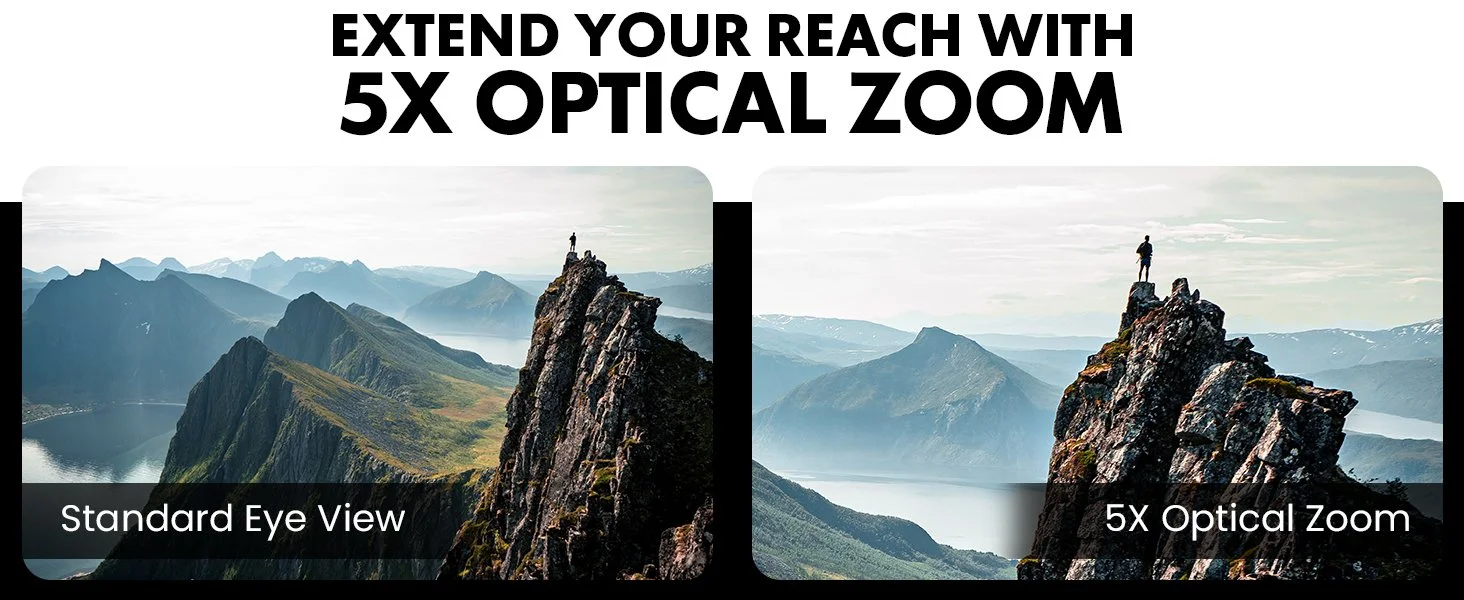 5x Optical Zoom: Get close to your subject with sharp, high-quality detail using the lens itself.