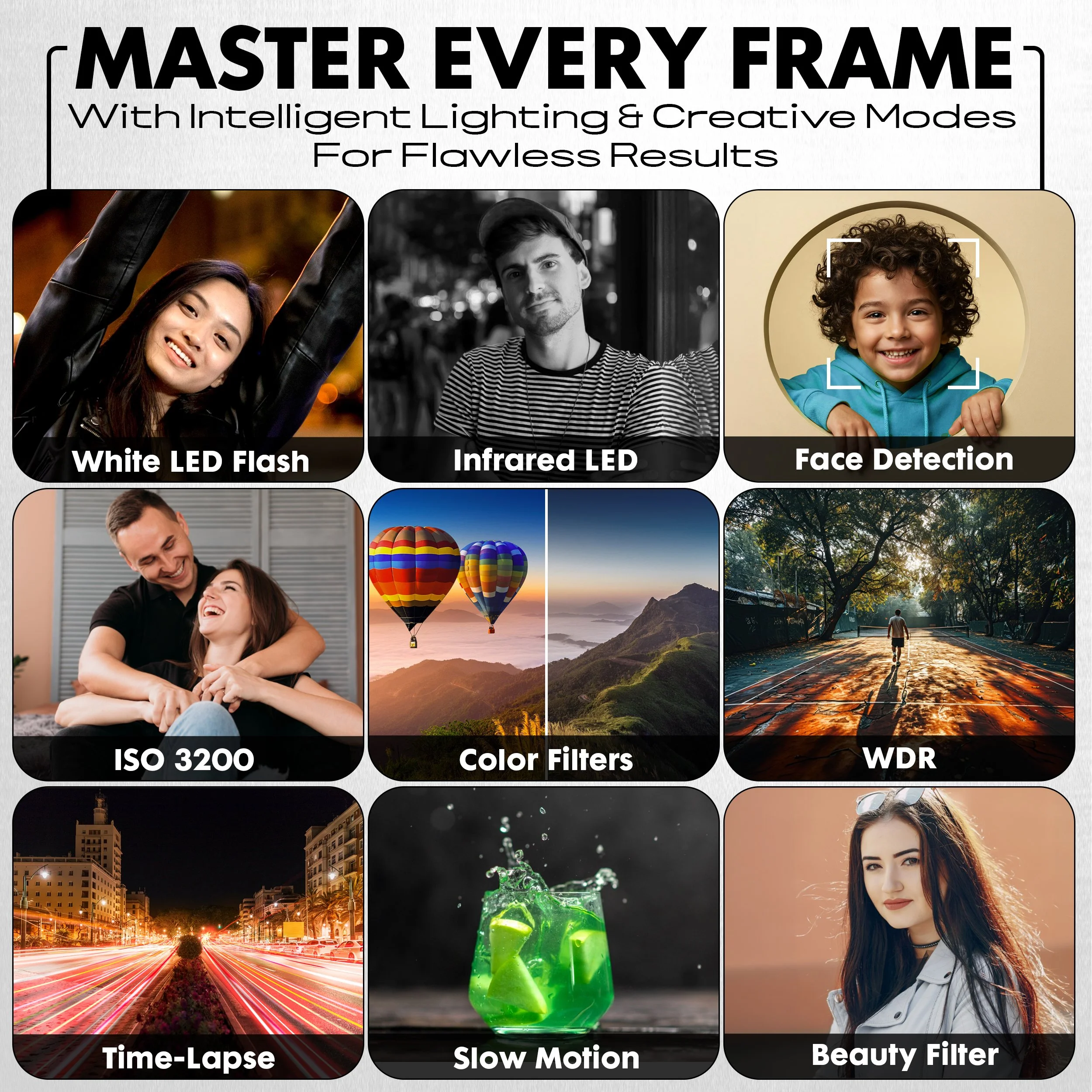 Adapt to any scene with built-in tools designed to enhance your results. From LED flash and infrared night vision to ISO control, filters, and dynamic shooting modes, every feature works together to expand your creative options.