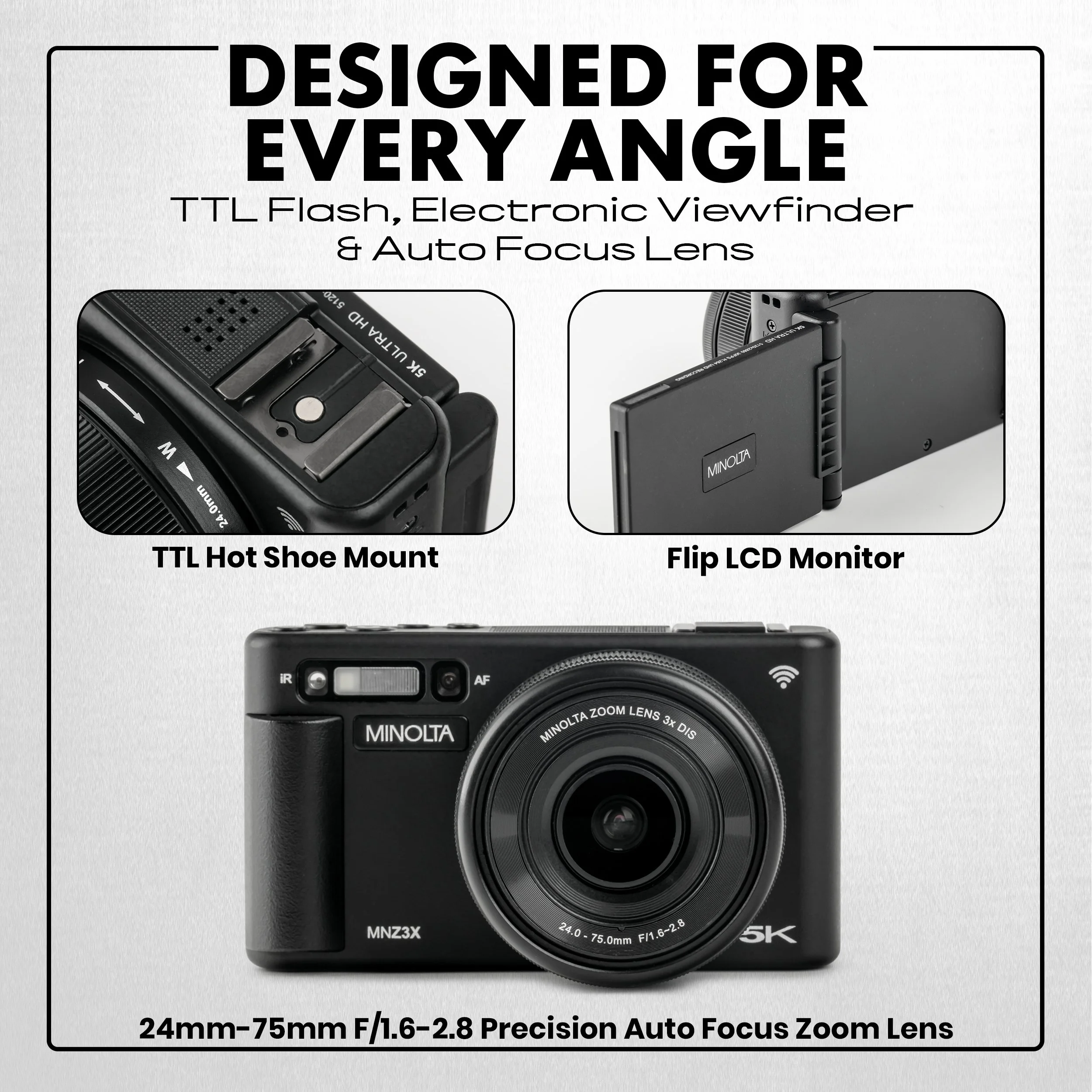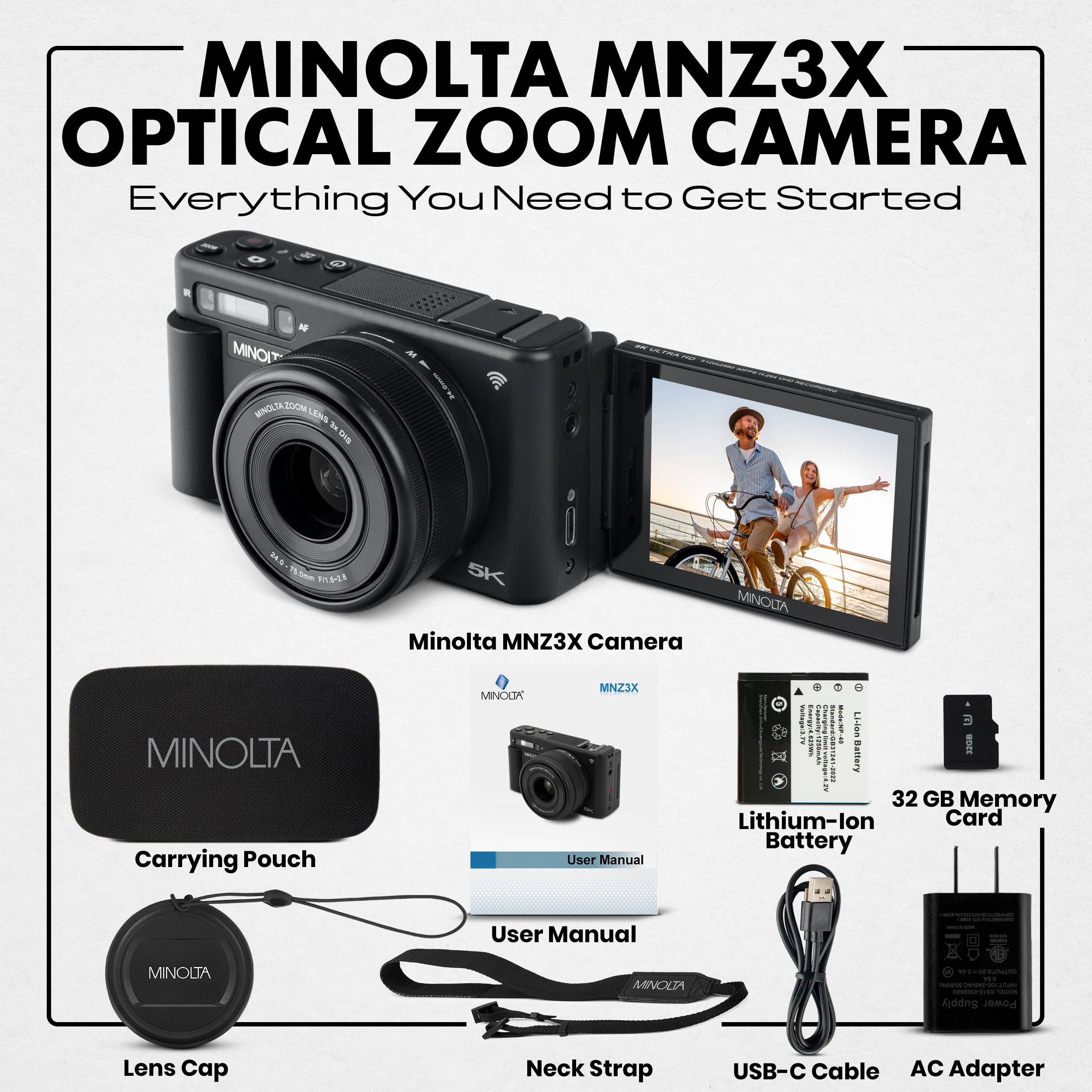 Unleash your creativity with the Minolta MNZ3X, a feature-packed digital camera designed to deliver professional-grade performance in a compact, user-friendly form. Capture every detail with stunning 72MP photo resolution and record 5K Ultra HD video for vibrant, cinematic results. The versatile 24mm–75mm optical zoom lens (3x zoom) with a fast F/1.6–2.8 aperture delivers clarity and depth whether you're shooting wide landscapes, portraits, or closer details. Built-in image stabilization and autofocus reduce blur, while the electronic manual focusing ring and zoom ring provide precise, hands-on control.