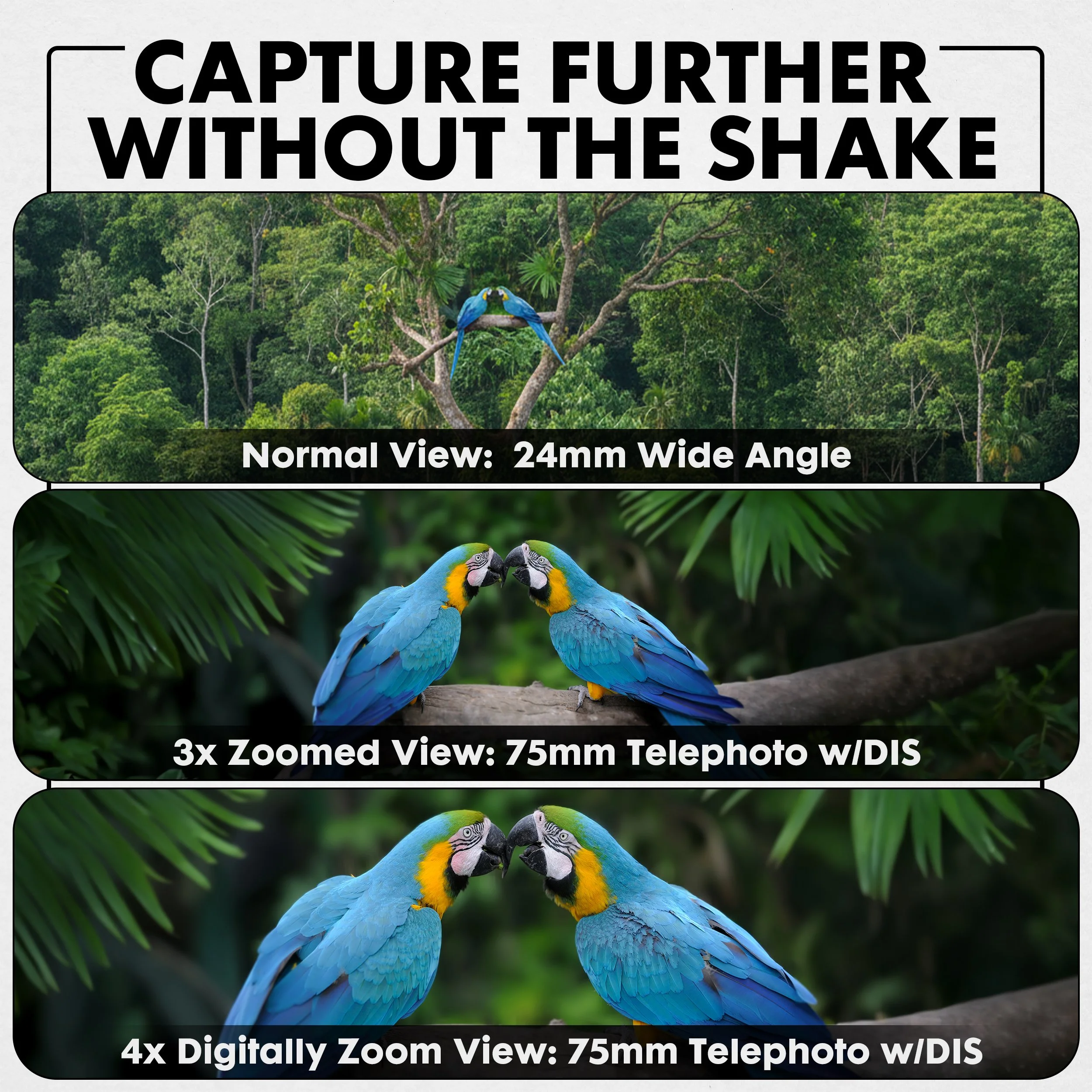 Frame every shot your way with a 24mm–75mm optical zoom lens (3x zoom). Capture wide-angle scenes or bring distant subjects closer with true optical clarity, then extend your reach further with digital zoom.